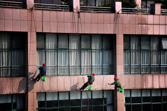 在信陽某區一高層建筑外,外墻清洗人員“蜘蛛人”向師傅與工友正懸掛在高樓外體上小心且仔細地清潔外墻和玻璃,毛頭蘸著添加了清潔劑的水在玻璃上掃一遍,然后用刮子把水刮掉,原本臟兮兮的玻璃馬上煥然一新。對于向師傅而言,這只是他每天固定的工作而已。